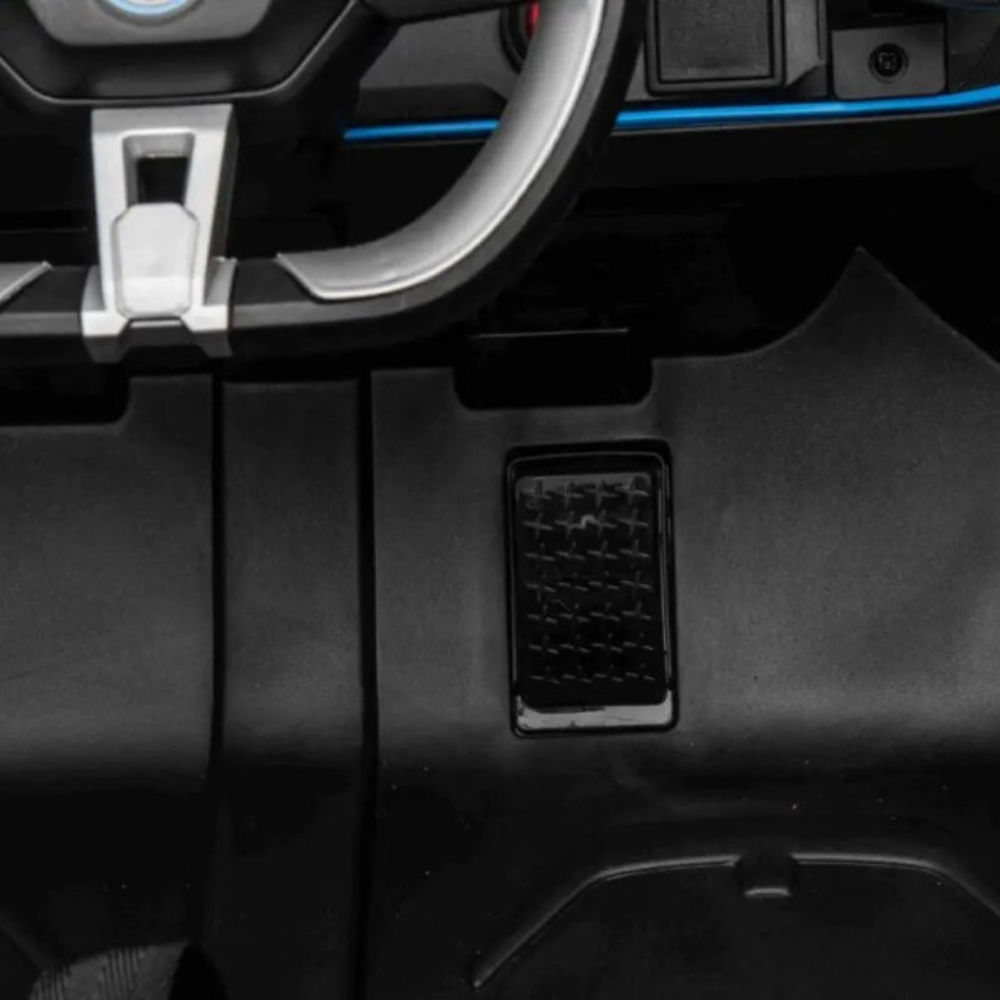 Kids can cruise to their favorite music with the fully upgraded sound system, featuring Bluetooth connectivity, USB input, and MP3 support. Working headlights add to the immersive feel, while a dashboard battery indicator helps parents keep track of power levels during play.
